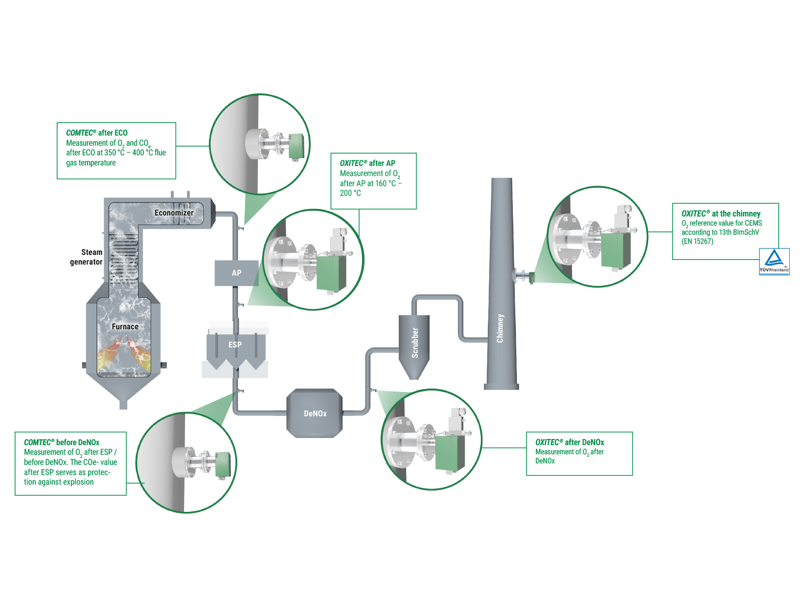 - O2 after LuVo (air preheater): The LuVo leakage can be monitored with the O2 value before and after LuVo. O2 monitoring in the combustion air mixed with rezi gas to control low NOx combustion.